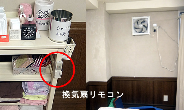 2番、4番、6番の換気扇は、ワゴン備え付けのリモコンスイッチで操作する。リモコンでは「ON・OFF」しかできないので、排気・吸気は紐で行う。基本的にリモコンでスイッチを入れると「排気」になるように設定しておく。換気扇が回らない場合は、受付横の主電源を確認する。(換気扇の赤ランプが点灯してない場合は主電源が入っていいない。)