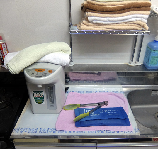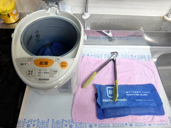 当院では、ホットパックを電子レンジではなく、お湯につけておくことで、湿熱性、保湿性を高めています。